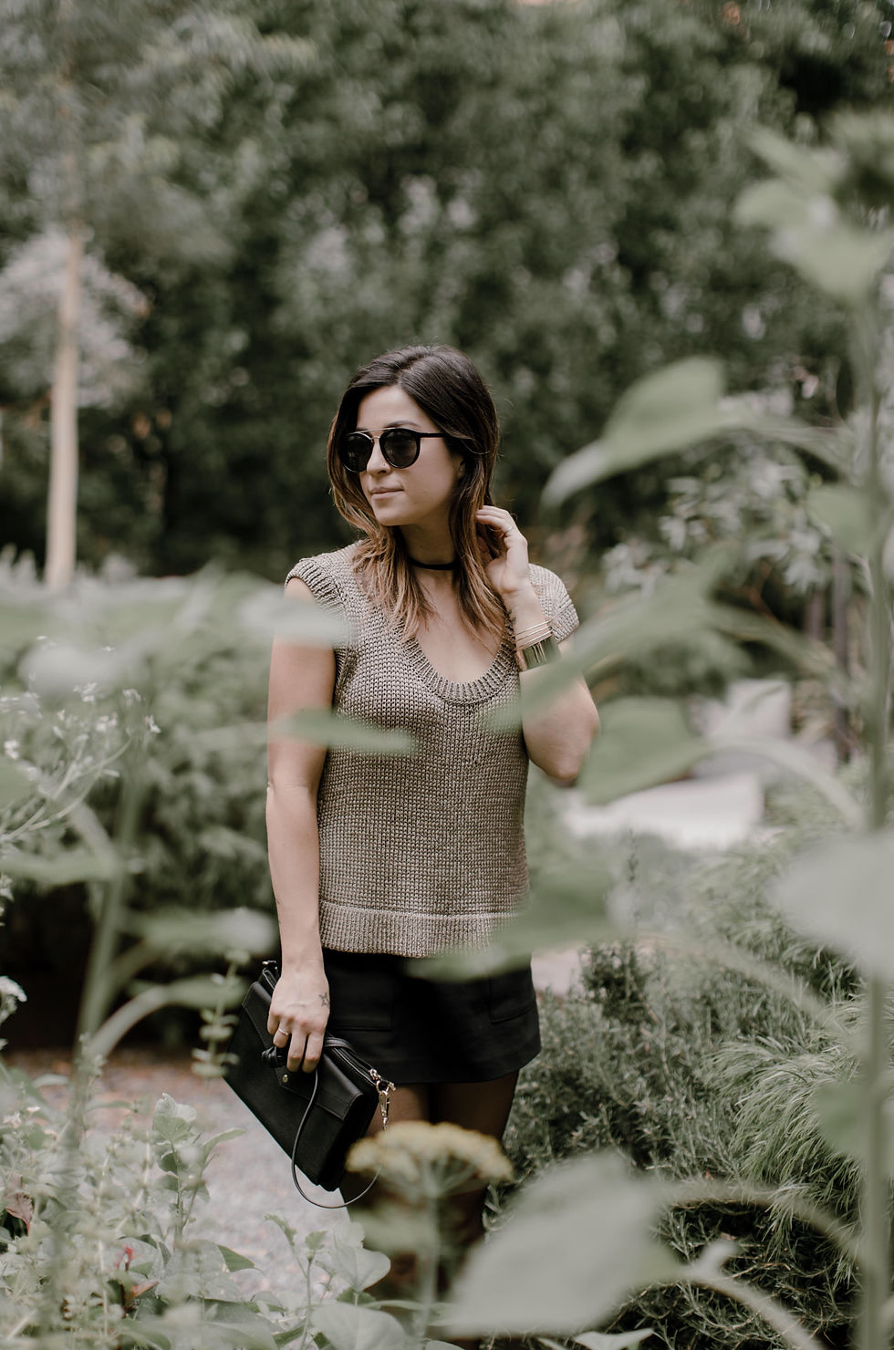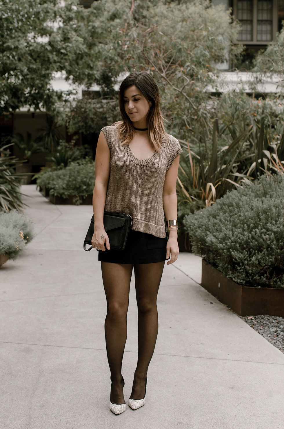 I styled a pair of black stockings with skorts, a textured metallic knit top and played off the gold with jewellery and a patterned pump.